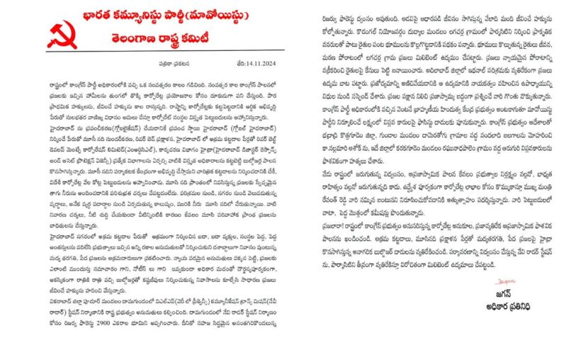 తెలంగాణ‌లో ముఖ్య‌మంత్రి రేవంత్‌రెడ్డి సార‌ధ్యంలోని కాంగ్రెస్ పాల‌న‌పై మావోయిస్టు పార్టీ సంచ‌ల‌న బ‌హిరంగ‌ లేఖ‌ను గురువారం విడుద‌ల చేసింది.
