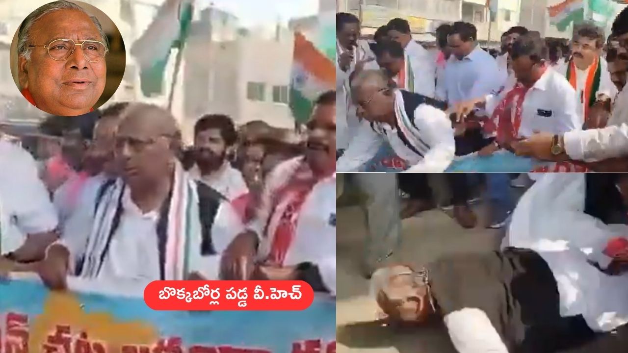 ర్యాలీ సందర్భంగా ఫ్లెక్సీ బ్యానర్ పట్టుకుని ముందుకు నడుస్తున్న వి. హనుమంతరావు ఒక్కసారిగా తడబడి కిందపడ్డారు. వెంటనే సహచర నాయకులు ఆయనను పైకి లేపి సాయం చేశారు. అనంతరం ఆయన మళ్లీ ర్యాలీలో పాల్గొన్నారు.