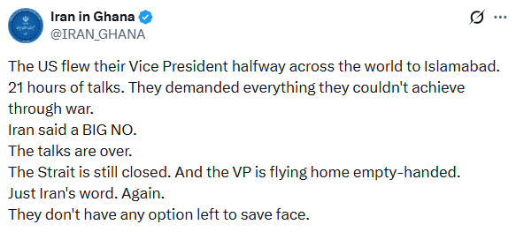 చర్చలు ముగిసిన వెంటనే ఘనాలోని ఇరాన్ రాయబార కార్యాలయం సోషల్ మీడియా వేదికగా అమెరికాపై తీవ్ర విమర్శలు చేసింది. యుద్ధం ద్వారా సాధించలేని డిమాండ్లను చర్చల టేబుల్ వద్ద వాషింగ్టన్ అడుగుతోందని ఆరోపించింది.